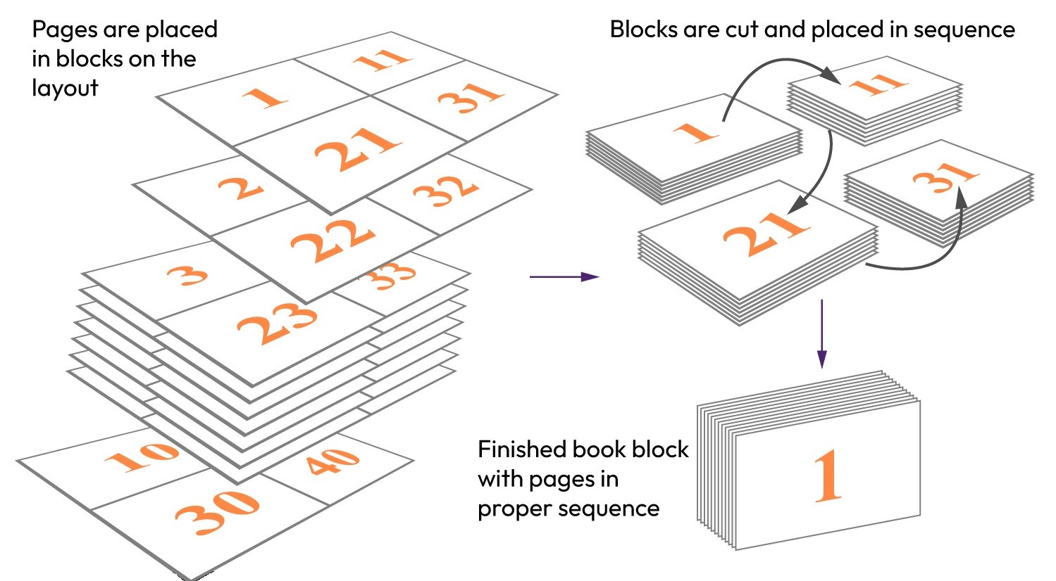 Book production has diversified from high-volume runs to single-copy. Layout planning for book production, influenced by binding method, size, orientation, press format, and spine alignment. Flat unbound jobs are that require free shape nesting and ganging is relatively easier than book imposition.