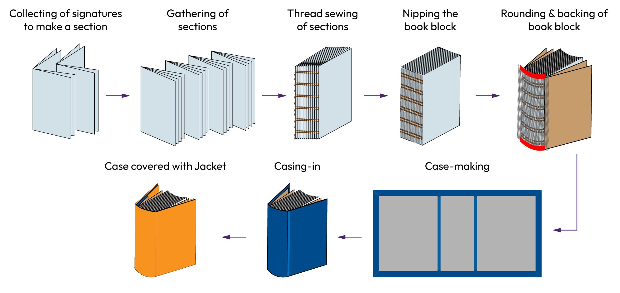 Case binding (or side sewn binding) is commonly used for high-quality books with a longer lifespan, offering durability and a premium finish. In addition to the inner pages, it often includes components such as jackets, hardcovers, and endpapers. The printed sheets are folded into sections (signatures), gathered in sequence, sewn through the fold, and then bound together.